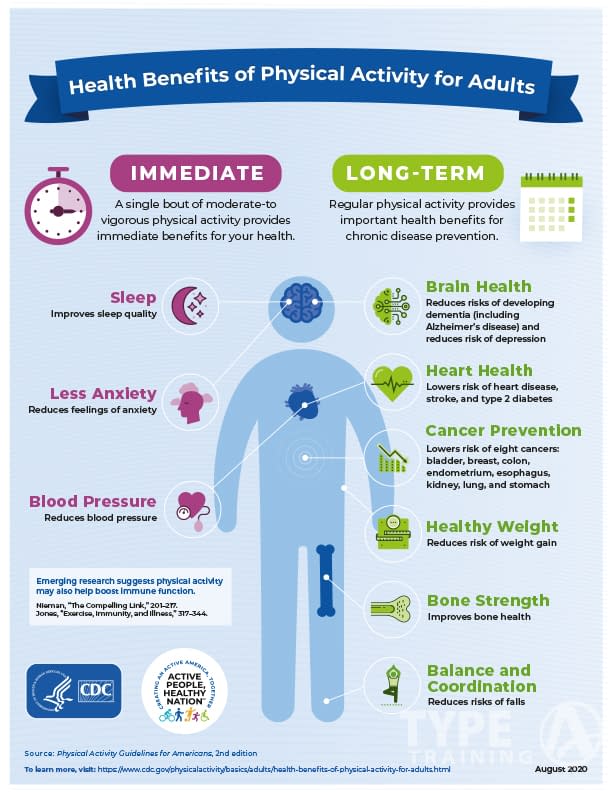 Staying active can help manage weight, improve mood, and decrease the risk of many health conditions.