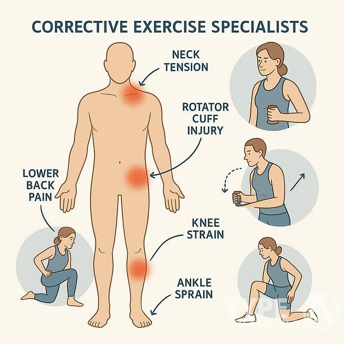 - Corrective exercise specialists handle urban injuries like back pain, neck strain, and posture issues using movement analysis and targeted exercises.